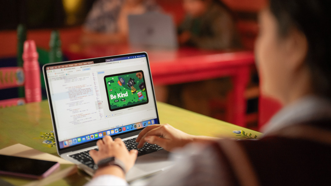 Michelle continues to level up her skills and push the limits of her imagination — working seamlessly between her Apple devices throughout each stage of the development process. After drawing her characters with pencil and paper, she perfects them in Adobe Illustrator on iPad with Apple Pencil. Then, she brings them to life — mapping out the user journey in Freeform on iPad and programming in Xcode on Mac.