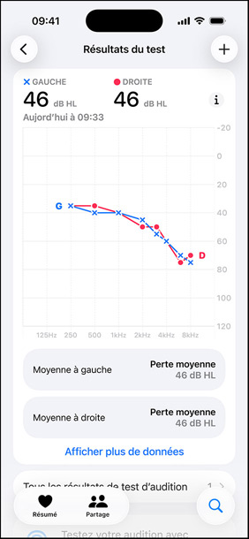 Tout est privé, sécurisé et facile à gérer. Les données de votre Test d’audition restent privées et sont stockées en toute sécurité dans l’app Santé de votre appareil. À tout moment, vous pouvez repasser le test, en télécharger les résultats, surveiller votre audition et lire des articles sur la santé auditive.