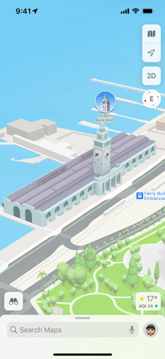 更新至 iOS 15、iPadOS 15 及 macOS Monterey,即可取得最新的地圖 app 功能,包括互動地球儀;適用於三藩市、洛杉磯、紐約市和倫敦等城市的 3D 體驗;以及附近公共交通等。