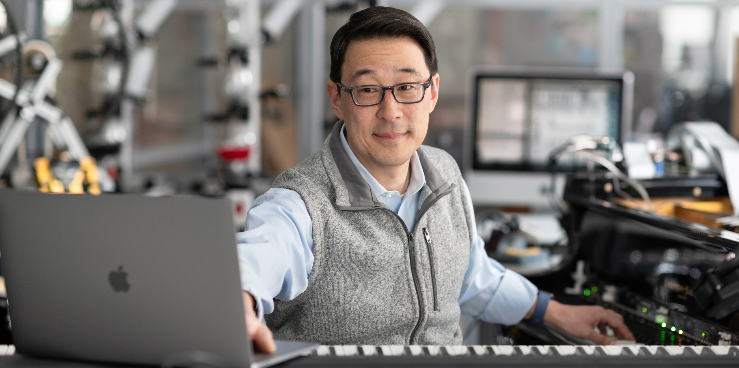 ด้วยความที่เป็นทั้งนักดนตรีและวิศวกร ความสนใจและการวิจัยของ Dr. Kim จึงอยู่ที่จุดบรรจบกันของศิลปะการแสดงและเทคโนโลยีเขาได้เลือกเทคโนโลยีของ Appleเป็นขุมพลังให้แล็บนวัตกรรมของเขาเพื่อที่จะได้สร้างสภาพแวดล้อมที่จะช่วยให้ค้นพบไอเดียอันแสนวิเศษได้ในแบบที่ไม่คาดคิด
