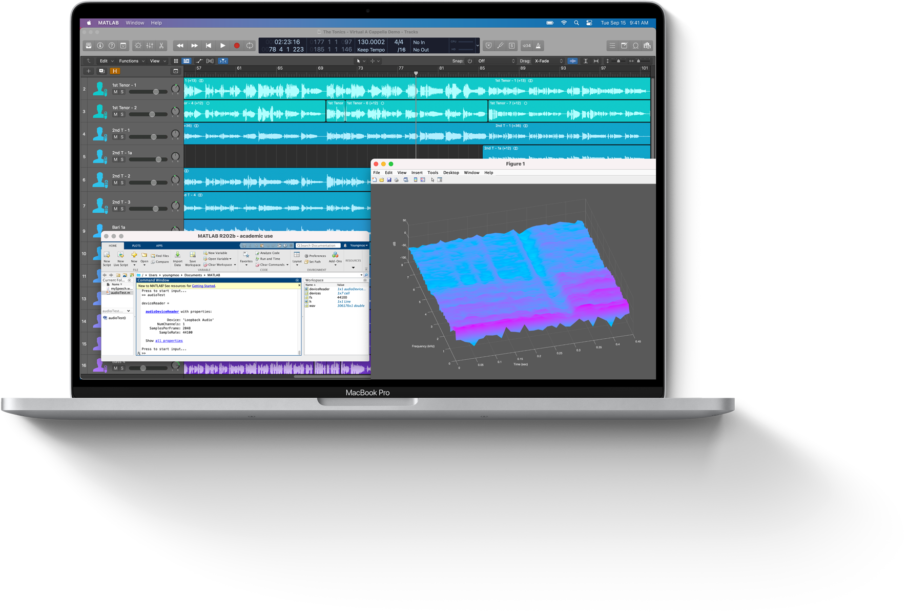 MacBook Pro Mac สามารถจัดการกับแอปดนตรีและแอปสร้างภาพระดับมืออาชีพอย่างเช่น Logic Pro และ MATLAB ได้อย่างง่ายดายซึ่งช่วยขยายขีดจำกัดของการวิจัยเรื่องการฟังของระบบโดย Dr. Kim ได้ใช้เครื่องดนตรีและหุ่นยนต์ที่สร้างขึ้นเอง