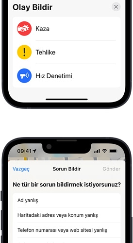 Favori kafenizdeki öğle yemeği saatleri yanlış mı? Otoyolun ortasında bir kamyon lastiği mi duruyor? Yaşadığınız sorun ne olursa olsun Harita’da konuyla ilgili hızla ve kolayca bildirimde bulunabiliyorsunuz. İşletmeler hakkındaki güncel bilgileri doğrudan yer kartı arayüzünden düzenleyin ve gönderin. Kazaları ve tehlikeleri Siri ile kolayca ve güvenli bir şekilde bildirin. “İleride kaza var” veya “Yolda bir şey var” demeniz yeterli. Siri sizin için olay bildiriminde bulunur. Haritada gösterilen bir olay geçerliliğini yitirmişse bunu da bildirebilirsiniz. Üstelik tümünü ellerinizi kullanmadan ve dikkatinizi yoldan ayırmadan yapabilirsiniz.