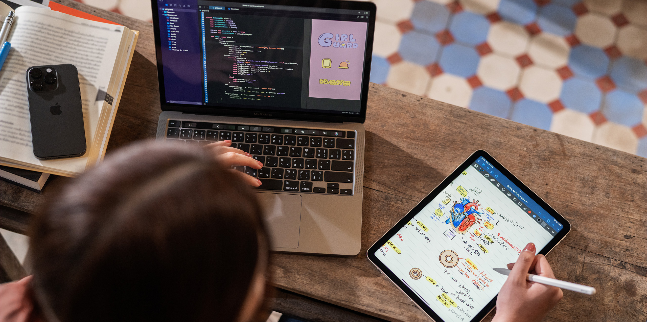 For med school, Gam loves using iPad for drawing and sketching her next inventions. She uses Apple Pencil with Goodnotes on iPad to bring anatomy and biochemistry notes to life, and Keynote to create compelling presentations that showcase her data research — which is focused on improving access to healthcare in rural communities across Thailand and beyond.